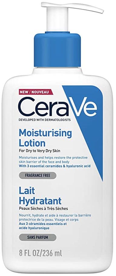 CeraVe Moisturizing Lotion for Normal to Dry Skin with Hyaluronic Acid is an oil-free, lightweight moisturizer designed to provide 24-hour hydration and restore the skin’s natural barrier.