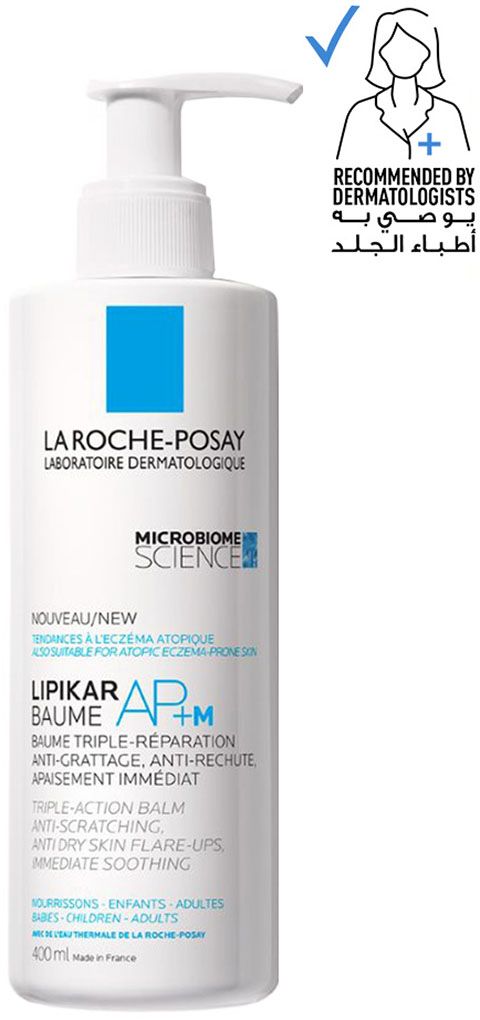 Lipikar Baume AP+M rebalances skin microbiome, and soothes skin and reduces scratching immediately.