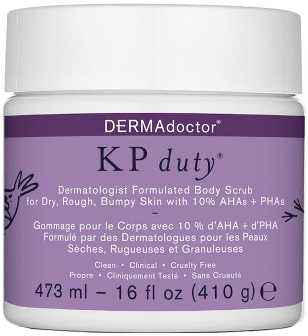 Formulated with 10% Alpha Hydroxy Acids, DermaDoctor KP Duty Dermatologist Formulated Body Scrub offers chemical peel and microdermabrasion benefits by lifting dead skin cell buildup from the skin's surface.